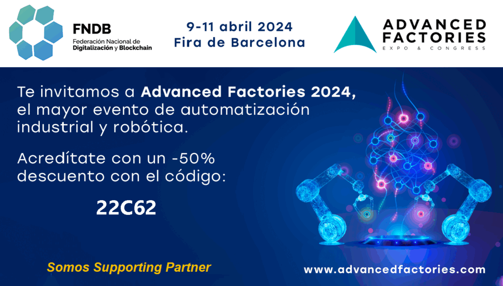 La Federación Nacional de Digitalización y Blockchain (FNDB) se complace en invitarte a Advanced Factories 2024, el evento líder en automatización industrial, robótica e inteligencia artificial en el sur de Europa. Esta cita anual, que se celebrará del 9 al 11 de abril en Fira Barcelona – Gran Vía, es un punto de encuentro crucial para profesionales que buscan estar a la vanguardia de la Industria 4.0. Un Congreso Europeo sobre Innovación Industrial Advanced Factories acogerá el Industry 4.0 Congress, el mayor congreso europeo dedicado a la innovación industrial. Expertos de renombre internacional compartirán las últimas tendencias y claves para implementar nuevos modelos de negocio en el entorno de la industria avanzada y digital. Este evento representa una oportunidad única para profundizar en las tecnologías más punteras y descubrir los sistemas de automatización y fabricación más innovadores. Tecnologías que Transforman la Industria #AF2024 es la plataforma ideal para explorar las últimas innovaciones en campos como el cloud industrial, digital twins, machine learning, ciberseguridad, big data, IoT, inteligencia artificial, y VR/AR, entre otros. Estas tecnologías están en el corazón de la transformación industrial, impulsando la mejora de la competitividad, el desarrollo de nuevos modelos de negocio, la optimización de procesos de producción y la creación de nuevas experiencias de cliente. Un Punto de Transferencia Tecnológica y Conocimiento Además de ser un escaparate de tecnologías emergentes, Advanced Factories se posiciona como un punto clave de transferencia tecnológica y conocimiento. Los asistentes tendrán la oportunidad de compartir y aprender de los casos de éxito más relevantes del panorama actual, facilitando así el intercambio de ideas y experiencias que pueden ser cruciales para la evolución de sus propias fábricas y empresas. Aprovecha un Descuento Exclusivo Gracias a la colaboración entre la FNDB y Advanced Factories, te ofrecemos un 50% de descuento en tu entrada. Esta es tu oportunidad para no perderte la gran cita profesional para la industria y para impulsar tu fábrica al mayor nivel de competitividad e innovación. Regístrate AQUI con el código de descuento que aparece en la imagen y prepárate para sumergirte en un mundo de innovación industrial que definirá el futuro de la manufactura y la producción. Advanced Factories 2024 no es solo un evento; es el inicio de una nueva era para la industria manufacturera, marcada por la adopción de tecnologías disruptivas y el avance hacia la automatización. Asegúrate de formar parte de este movimiento transformador y descubre cómo las innovaciones de la Industria 4.0 pueden llevar tu empresa al siguiente nivel de eficiencia y competitividad.