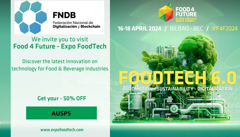 Desde la Federación Nacional de Digitalización y Blockchain (FNDB) tenemos el placer de brindarte la oportunidad de asistir al evento Food 4 Future – ExpoFoodTech. Del 16 al 18 de abril de 2024, el mundo de la tecnología alimentaria converge en Bilbao, España, para el evento Food 4 Future – ExpoFoodTech. Este evento de vanguardia reúne a más de 8,000 profesionales con el objetivo de explorar cómo la innovación, la digitalización y la sostenibilidad están reformando la industria alimentaria y de las bebidas. ¿Qué es Food 4 Future – ExpoFoodTech? Food 4 Future – ExpoFoodTech es más que una exposición; es una plataforma de innovación donde líderes de opinión, startups y empresas consolidadas presentan las últimas soluciones y tecnologías. La cita es en el Bilbao Exhibition Centre, un espacio dedicado a fomentar el intercambio de conocimientos y a establecer contactos que promuevan una industria alimentaria más eficiente y sostenible. Las Tendencias que Definirán el Futuro de la Alimentación La revolución FoodTech 6.0 está en marcha, impulsando la adopción de tecnologías disruptivas como la inteligencia artificial, el big data y el Internet de las Cosas (IoT). Estas tecnologías no solo optimizan los procesos de producción sino que también permiten personalizar los productos para satisfacer las nuevas demandas de los consumidores. Además, la sostenibilidad se posiciona como una necesidad urgente, buscando soluciones que orienten a la industria hacia prácticas más responsables con el medio ambiente. UK: País Socio Invitado y Líder en Innovación FoodTech El Reino Unido, como país socio invitado en la edición 2024, destaca por su crecimiento notable en la actividad de startups, financiación y atención de inversores en el ámbito FoodTech. Con Londres como epicentro, el ecosistema británico abarca desde aplicaciones enfocadas en el consumidor hasta soluciones avanzadas en procesamiento de alimentos, seguridad y trazabilidad, cocinas inteligentes y gestión de residuos y excedentes alimentarios. Participación y Reconocimiento en Food 4 Future Food 4 Future no sólo es una oportunidad para descubrir las últimas innovaciones sino también para obtener reconocimiento a través de los FoodTech Innovation Awards 2024. Además, el evento ofrece un sinfín de actividades que fomentan el negocio y la diversión, incluyendo foros de startups, mapas mundiales de FoodTech, y tours guiados por tecnología, garantizando una experiencia enriquecedora para todos los participantes. Aprovecha el descuento y consigue tu pase para Food 4 Future haciendo clic En resumen, Food 4 Future – ExpoFoodTech 2024 es el epicentro de la transformación alimentaria, un evento imprescindible para aquellos interesados en la vanguardia de la tecnología alimentaria, la sostenibilidad y la innovación. Es una gran oportunidad para explorar cómo la tecnología está redefiniendo lo que comemos y cómo lo producimos, en búsqueda de un futuro más sostenible y eficiente para la industria alimentaria.